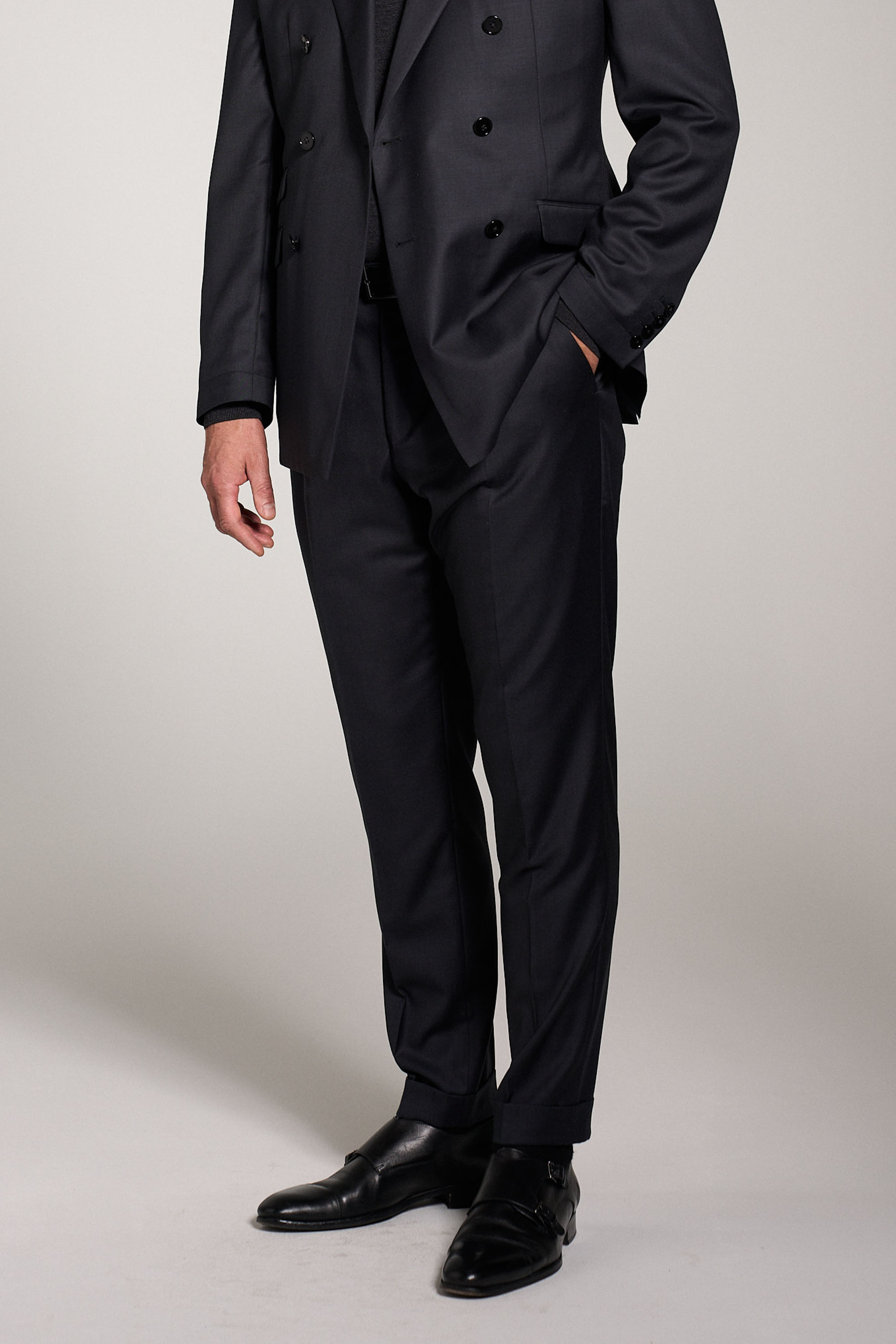 Modische, anthrazitgraue Hose in einem zeitgemäßen Fitting. Durch die eingearbeitete Bundfalte besitzt die Hose eine bequeme Oberschenkelweite. Sie läuft am Saum schlank zu und hat einen Umschlag. Das exklusive Tuch aus Schurwolle-Cashmere-Seide sorgt für einen luxuriösen, leichten Tragekomfort. Als Einzelstück oder zu einem Mix Anzug in unterschiedlichen Größen kombinierbar mit den Sakkos Zarus Mix oder Larus Mix Wolle Cashmere.