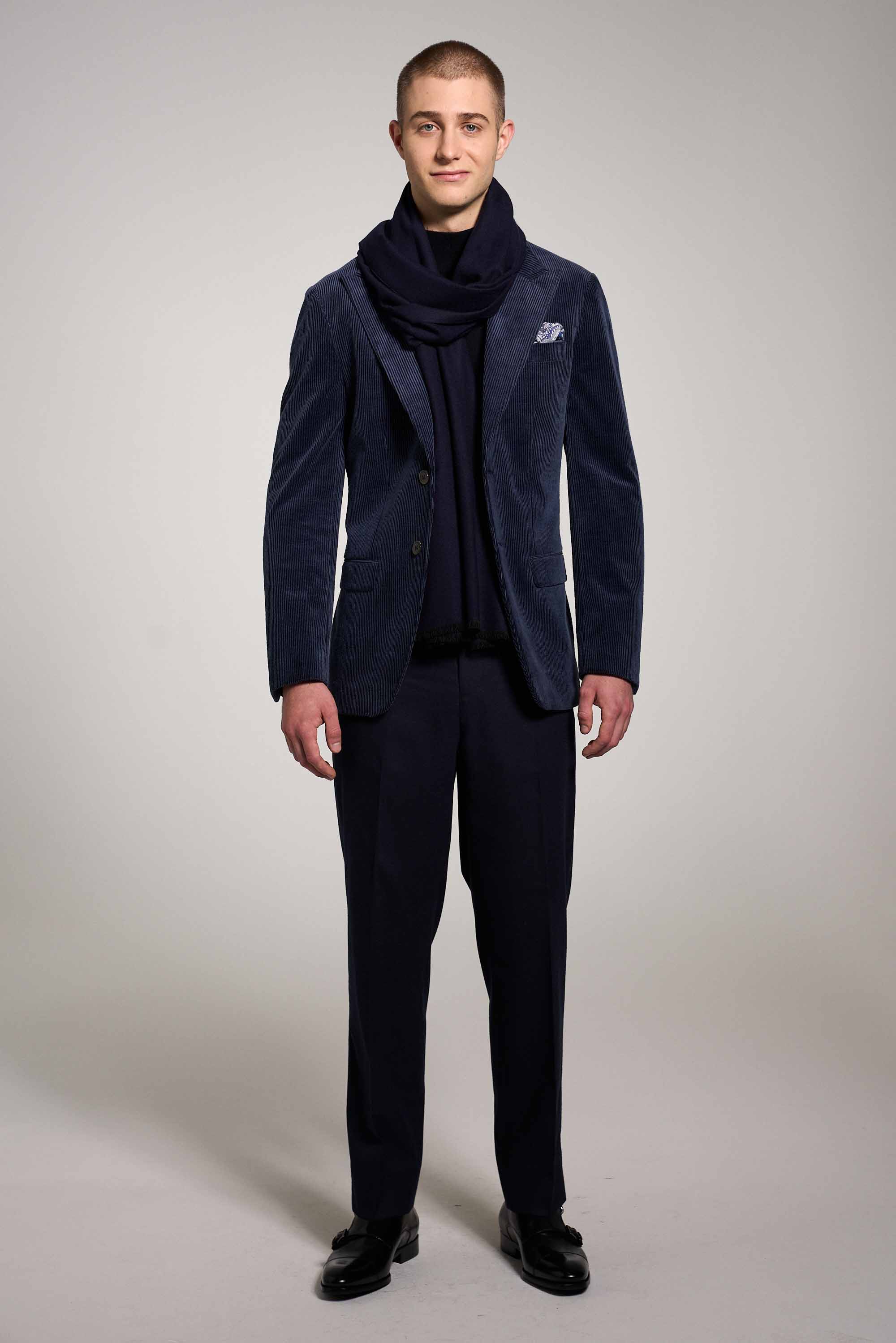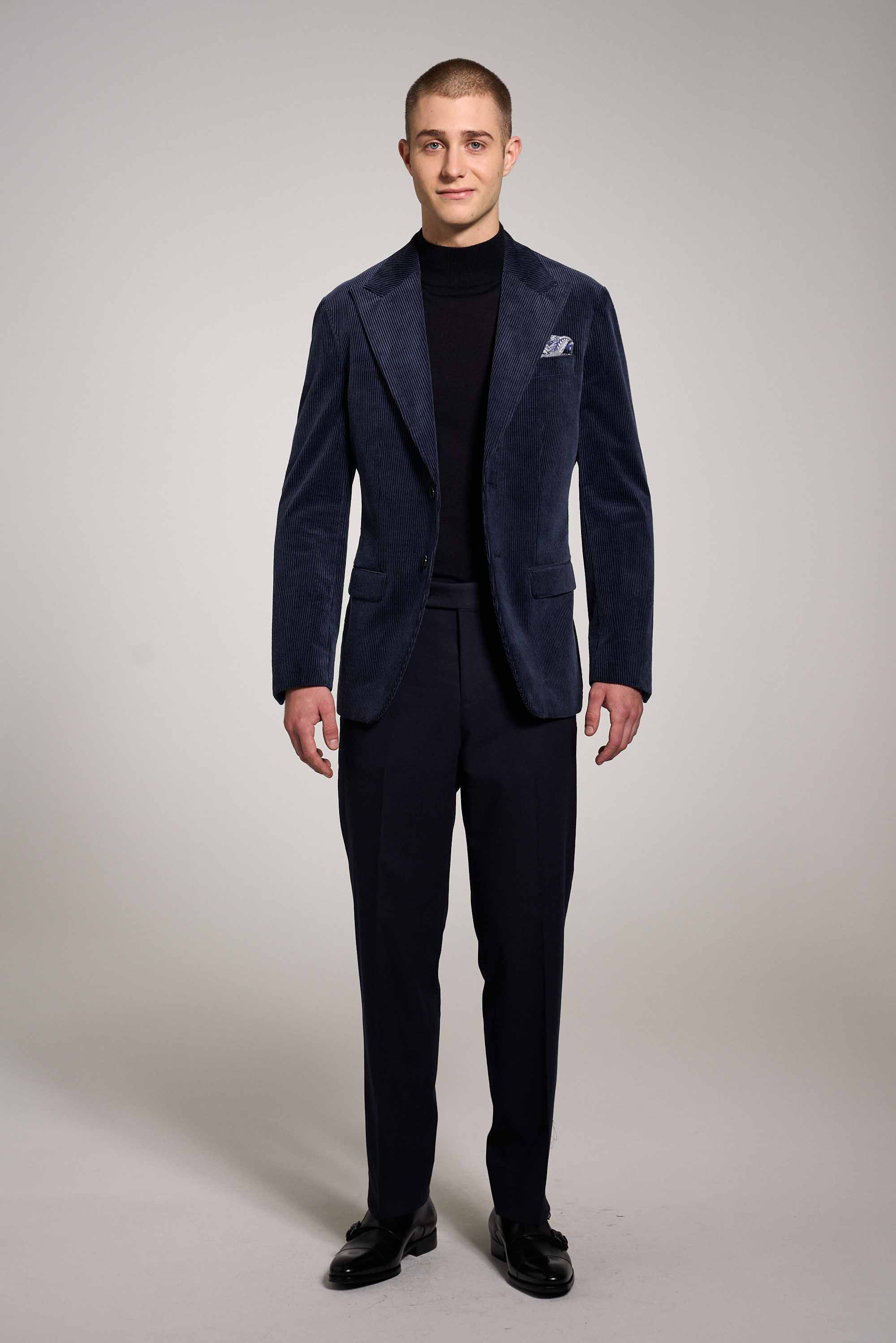 Blaues, legeres Cord Sakko. Mit einem breiten, steigenden Revers und körpernahen, soften Fitting . Das weiche Cordtuch aus Baumwolle-Elasthan sorgt für einen weichen und bequemen Tragekomfort. Sportlich mit einem Turtleneck-Pullover oder Business-konform mit Hemd und Krawatte zu kombinieren.