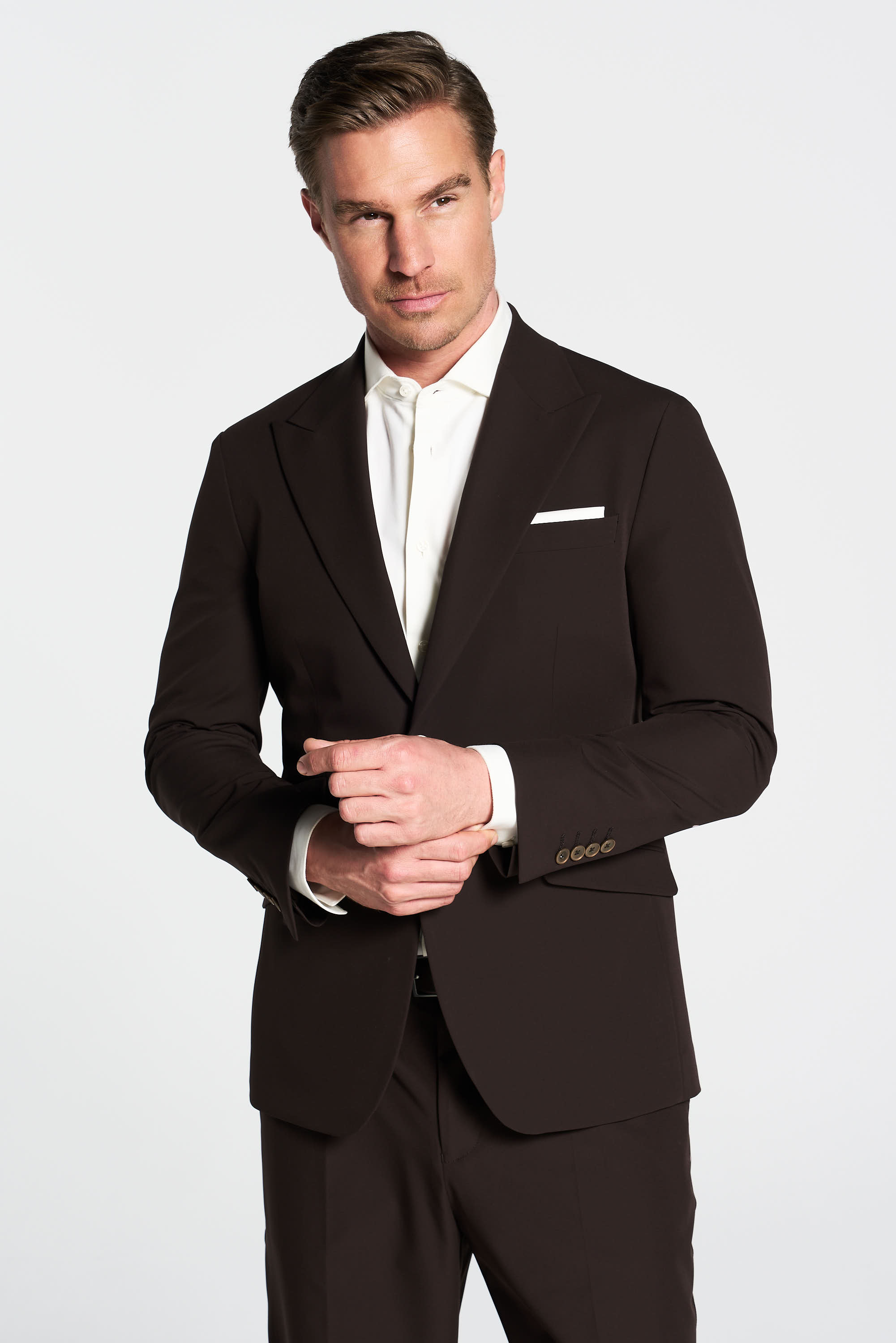 Modisches, dunkelbraunes Sommer-Sakko in zeitgemäßer Slim-Fit-Passform. Die innovative Super-Stretch-Qualität sorgt für einen besonders leichten und komfortablen Tragekomfort. Auch als Mix-&-Match-Anzug tragbar: kombinierbar in unterscheidlichen Größen mit der Hose Messy.