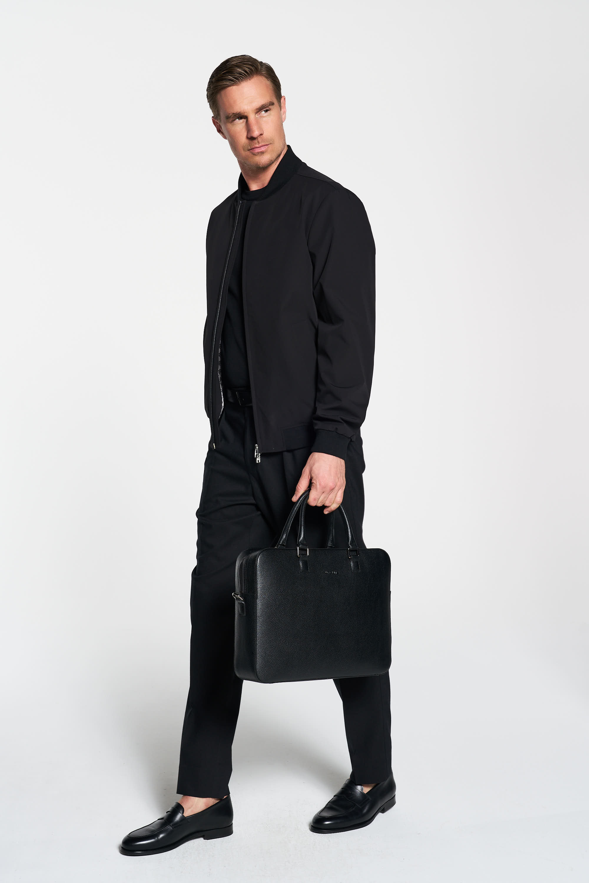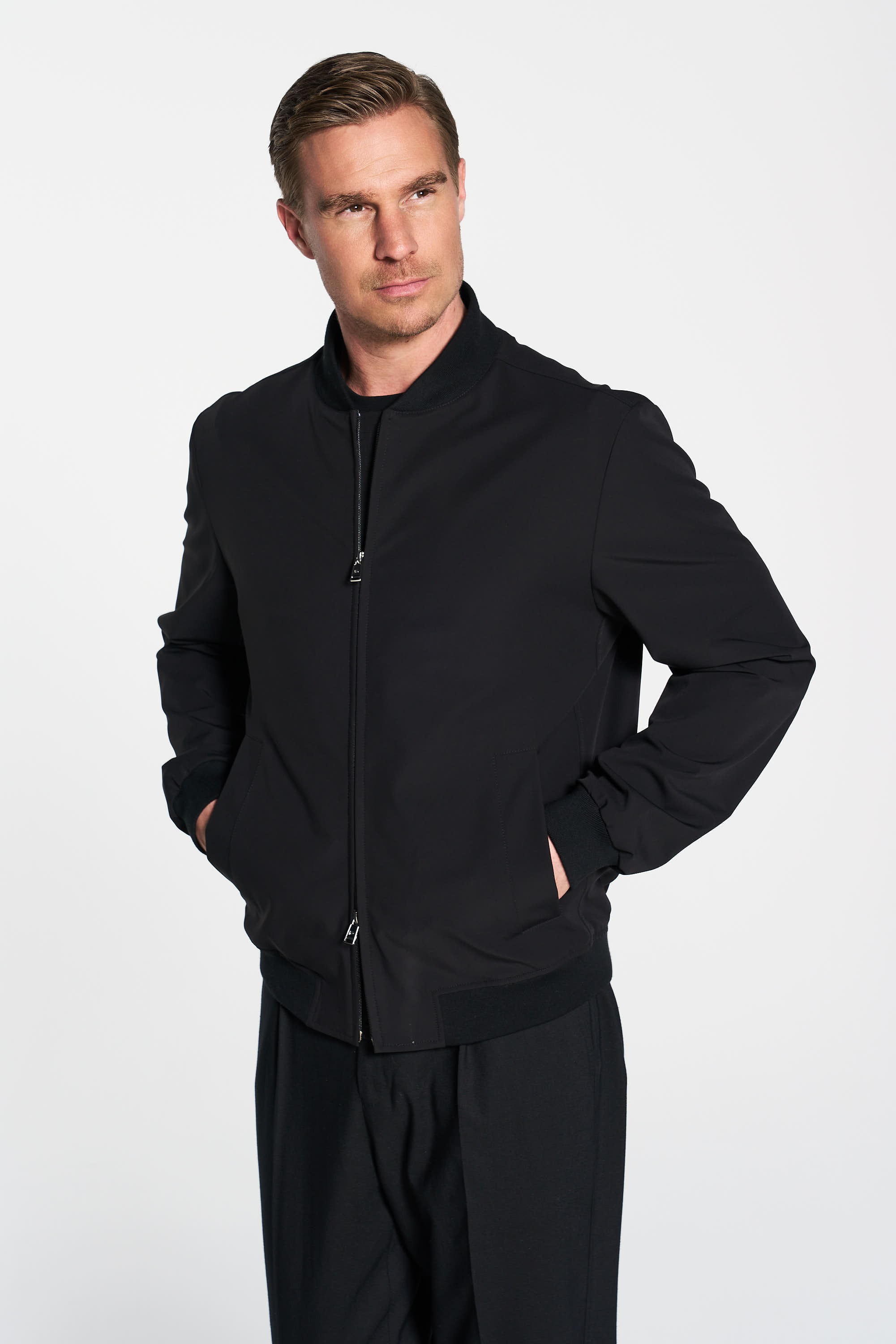 Schwarzer Blouson in modischer Passform. Die hochwertige Stretch-Qualität ist wasserabweisend, atmungsaktiv und bietet maximalen Komfort. Perfekt für einen sportlich-eleganten Look im Alltag.