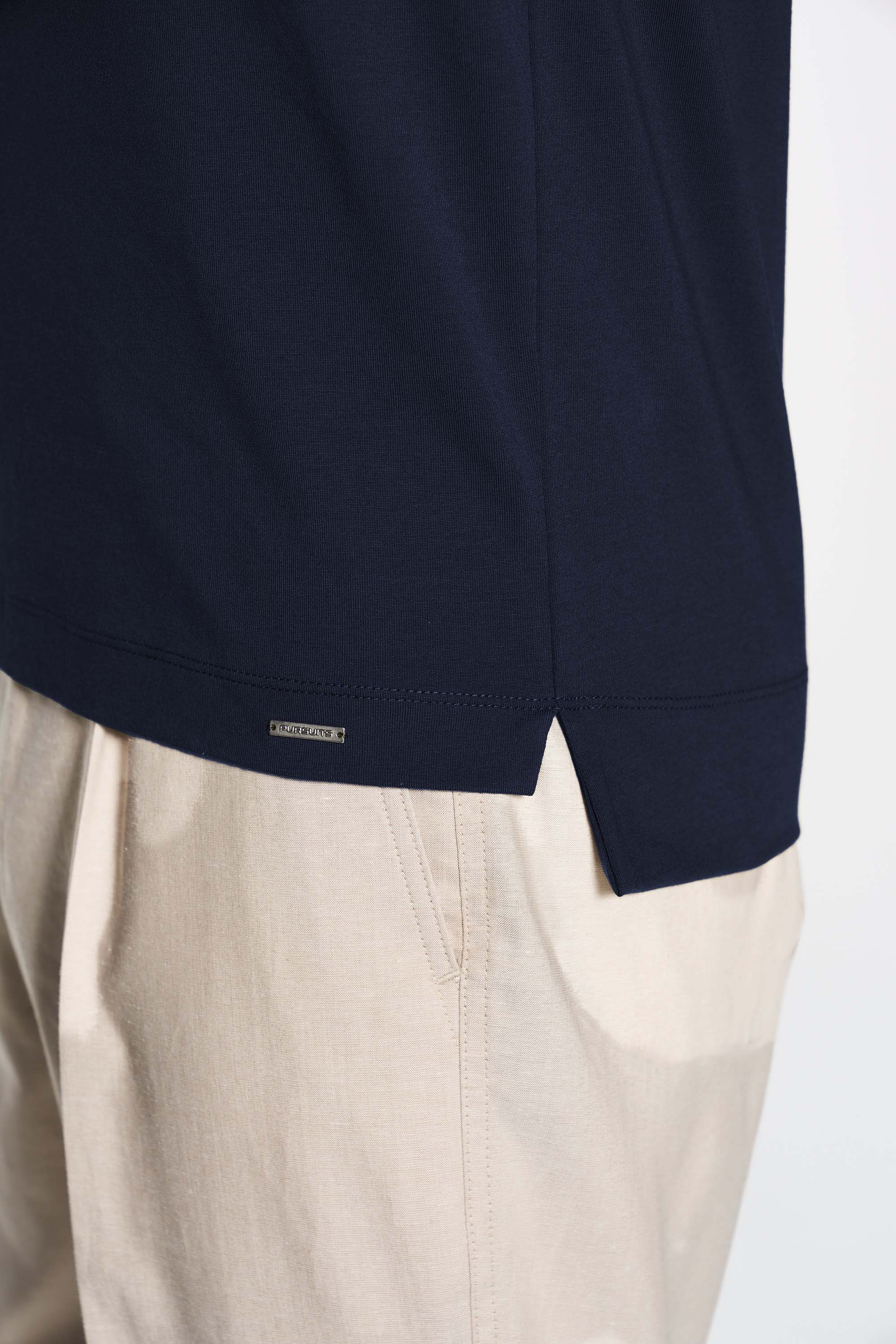 Modisch geschnittenes, dunkelblaues Slim-Fit T-Shirt mit Rundhalskragen und verlängerter Rückenlänge für eine moderne Passform. Die hochwertige Baumwolle-Elasthan-Qualität ist besonders soft und angenehm zu tragen. Vielseitig kombinierbar – sportiv zu Chinos oder Jogg-Pants sowie stilvoll unter einem Anzug. In sechs Farben erhältlich.