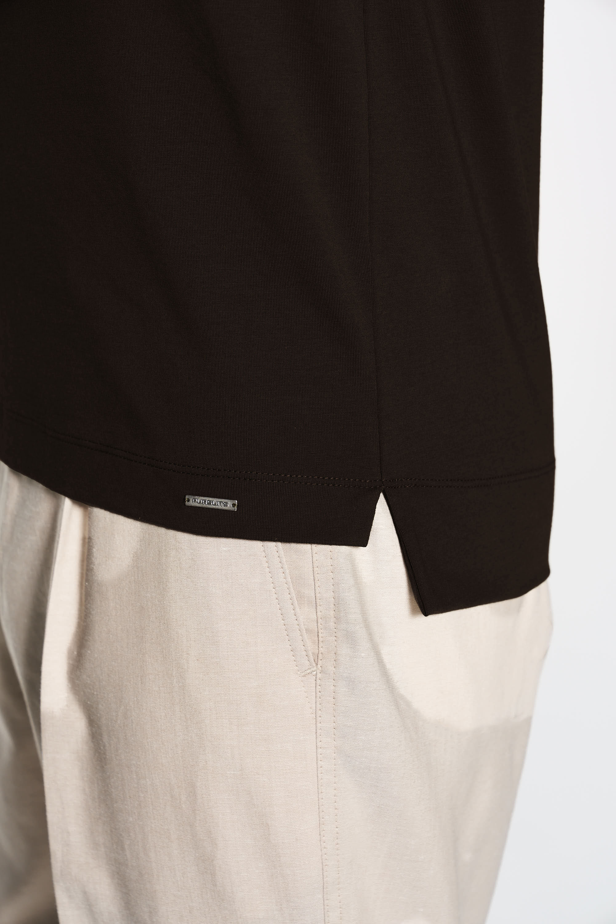 Modisch geschnittenes, dunkelbraunes Slim-Fit T-Shirt mit Rundhalskragen und verlängerter Rückenlänge für eine moderne Passform. Die hochwertige Baumwolle-Elasthan-Qualität ist besonders soft und angenehm zu tragen. Vielseitig kombinierbar – sportiv zu Chinos oder Jogg-Pants sowie stilvoll unter einem Anzug. In sechs Farben erhältlich.