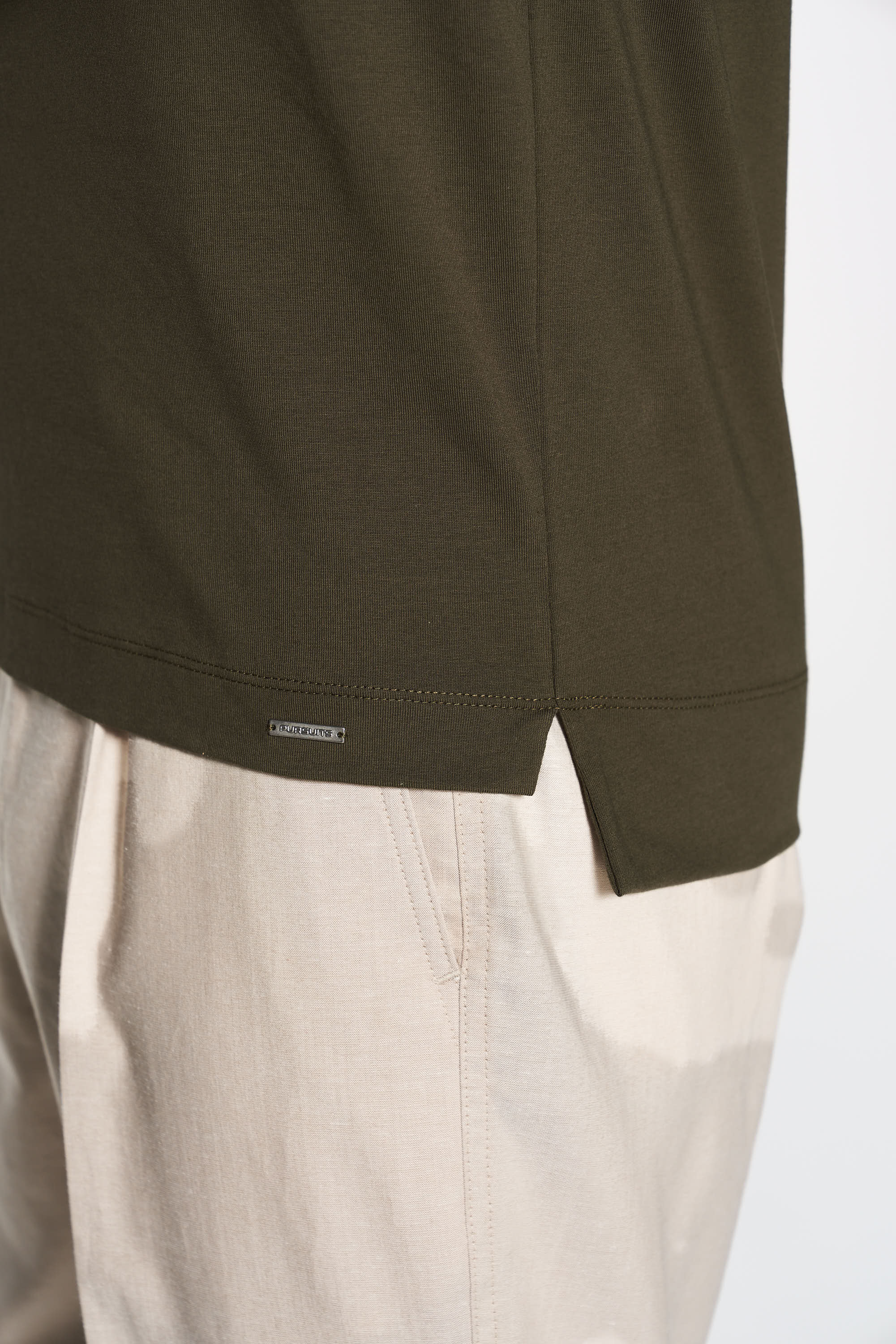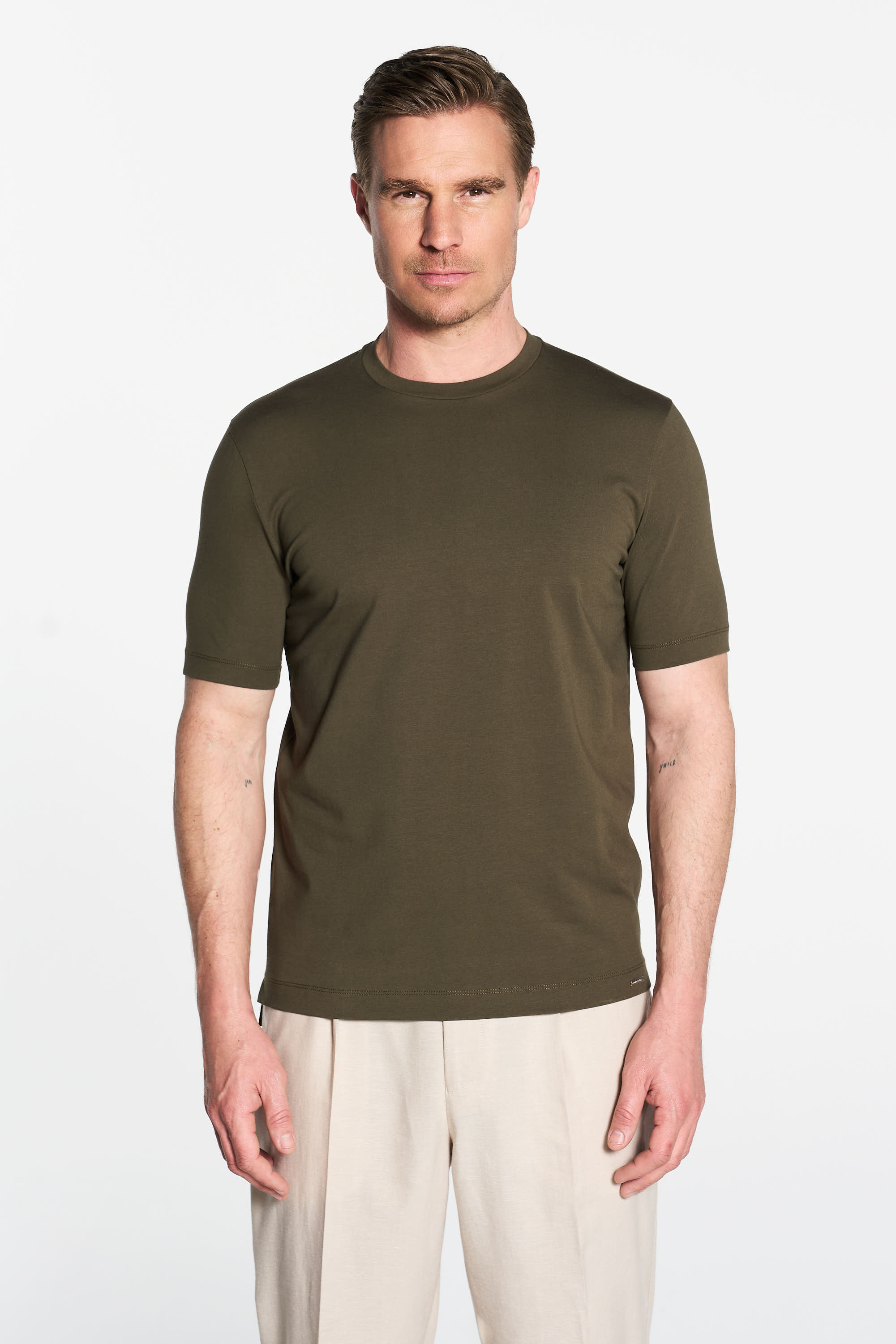 Modisch geschnittenes, olivgrünes Slim-Fit T-Shirt mit Rundhalskragen und verlängerter Rückenlänge für eine moderne Passform. Die hochwertige Baumwolle-Elasthan-Qualität ist besonders soft und angenehm zu tragen. Vielseitig kombinierbar – sportiv zu Chinos oder Jogg-Pants sowie stilvoll unter einem Anzug. In sechs Farben erhältlich.